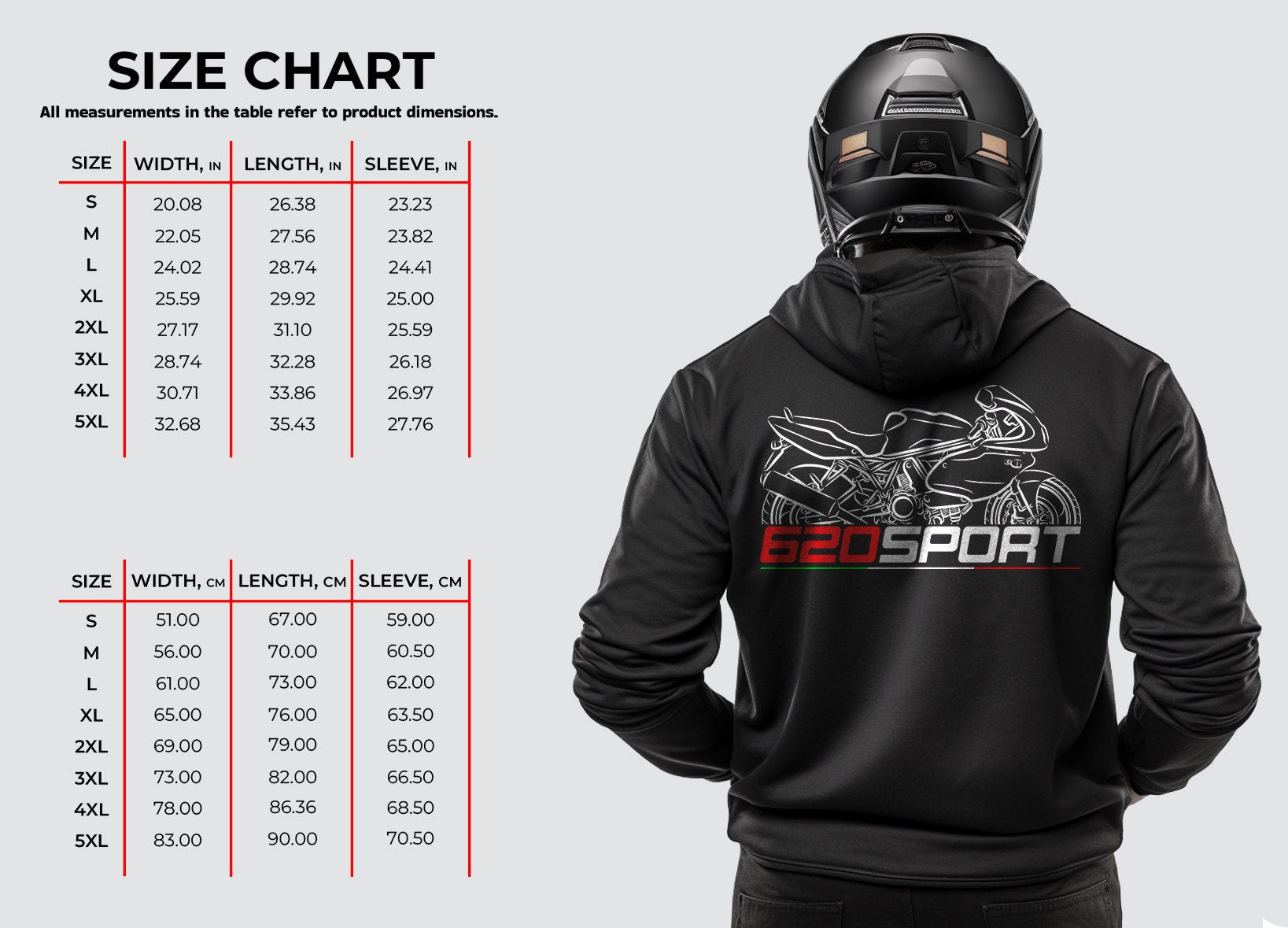Hoodies for Ducati 620 Sport Motorcycle RidersStay warm while riding your motorcycle with this high-quality hooded pullover inspired by the Ducati 620 Sport - designed to be the perfect source of warmth and comfort during your motorcycle journeys.This hoodie serves as the ultimate homage to these legendary motorcycles that have stolen the hearts of riders worldwide. Crafted with a three-panel fleece lining, this pullover hoodie ensures durability as you ride. Double stitched for added strength, it offers ample room for your riding movements. You can also find t-shirts with this same design in our shop.Whether you're a dedicated enthusiast of this bike or simply a lover of motorcycles, this hoodie is an excellent way to express your affection for these iconic bikes. With a variety of sizes to choose from, it also makes an ideal gift for any motorcycle rider or motorcycle enthusiast.Why wait? Get your motorcycle hoodie today and savor the epitome of style, comfort, and adventure! This stylish hoodie is a great way to upgrade your bike life and stands out as one of the finest gifts for motorcycle riders, motorbike aficionados, motorcycle fans and lovers of motorcycle gear.Unisex Classic Pullover Hoodie:- Classic fit