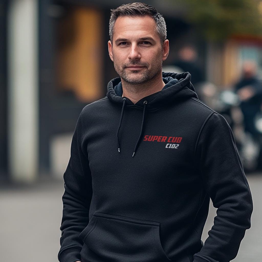 Hoodie for Honda C102 Super Cub Motorcycle RidersStay warm while riding your motorcycle with this high-quality hooded pullover inspired by the Honda C102 Super Cub and designed to be the perfect source of warmth and comfort during your motorcycle journeys.This hoodie serves as the ultimate homage to these legendary motorcycles that have stolen the hearts of riders worldwide. Crafted with a three-panel fleece lining, this pullover hoodie ensures durability as you ride. Double stitched for added strength, it offers ample room for your riding movements. You can also find t-shirts with this same design in our shop.Whether you're a dedicated enthusiast of this bike or simply a lover of motorcycles, this hoodie is an excellent way to express your affection for these iconic bikes. With a variety of sizes to choose from, it also makes an ideal gift for any motorcycle rider or motorcycle enthusiast.Why wait? Get your motorcycle hoodie today and savor the epitome of style, comfort, and adventure! This stylish hoodie is a great way to upgrade your bike life and stands out as one of the finest gifts for motorcycle riders, motorbike aficionados, motorcycle fans and lovers of motorcycle gear.Unisex Classic Pullover Hoodie:- Classic fit