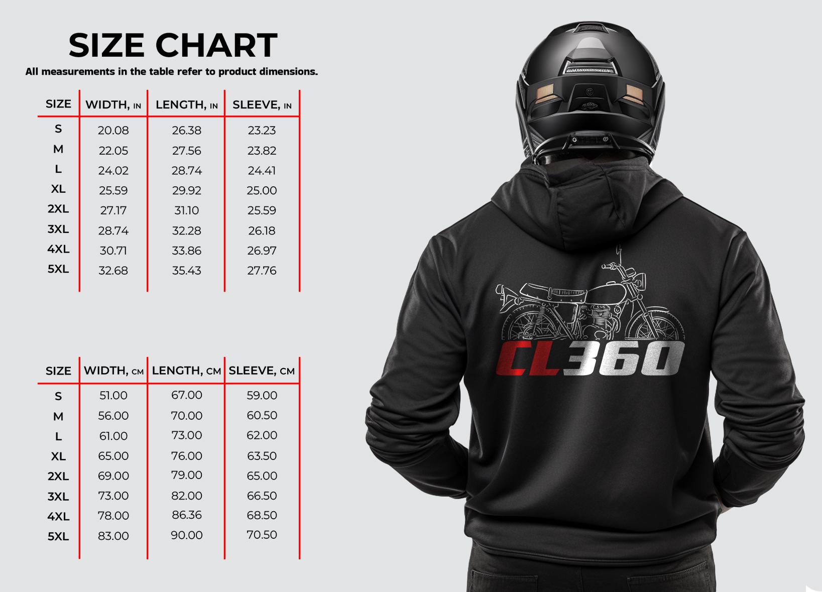 Hoodie for Honda CL360 Motorcycle RidersStay warm while riding your motorcycle with this high-quality hooded pullover inspired by the Honda CL360 and designed to be the perfect source of warmth and comfort during your motorcycle journeys.This hoodie serves as the ultimate homage to these legendary motorcycles that have stolen the hearts of riders worldwide. Crafted with a three-panel fleece lining, this pullover hoodie ensures durability as you ride. Double stitched for added strength, it offers ample room for your riding movements. You can also find t-shirts with this same design in our shop.Whether you're a dedicated enthusiast of this bike or simply a lover of motorcycles, this hoodie is an excellent way to express your affection for these iconic bikes. With a variety of sizes to choose from, it also makes an ideal gift for any motorcycle rider or motorcycle enthusiast.Why wait? Get your motorcycle hoodie today and savor the epitome of style, comfort, and adventure! This stylish hoodie is a great way to upgrade your bike life and stands out as one of the finest gifts for motorcycle riders, motorbike aficionados, motorcycle fans and lovers of motorcycle gear.Unisex Classic Pullover Hoodie:- Classic fit