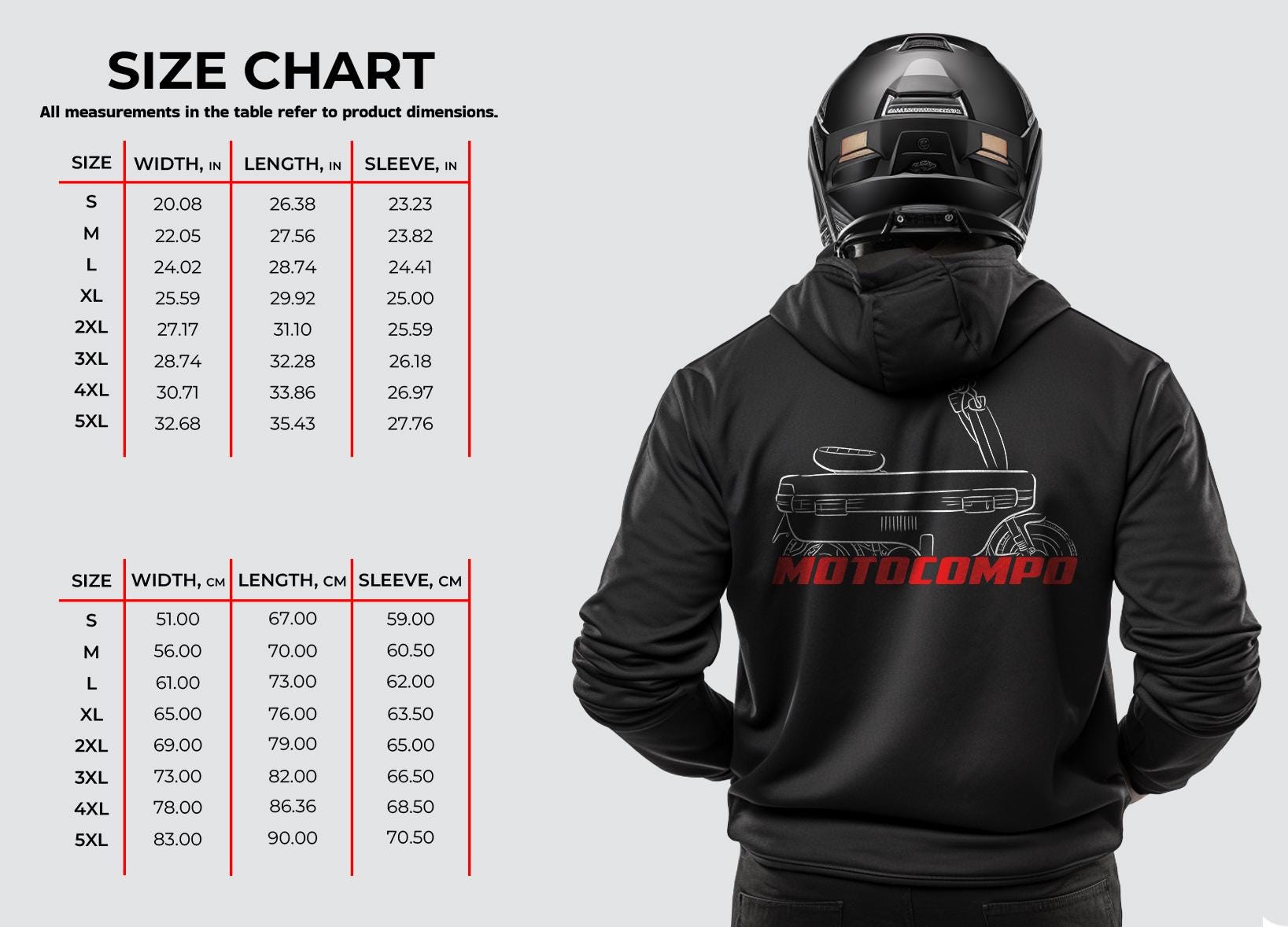 Hoodie for Honda Motocompo Motorcycle RidersStay warm while riding your motorcycle with this high-quality hooded pullover inspired by the Honda Motocompo and designed to be the perfect source of warmth and comfort during your motorcycle journeys.This hoodie serves as the ultimate homage to these legendary motorcycles that have stolen the hearts of riders worldwide. Crafted with a three-panel fleece lining, this pullover hoodie ensures durability as you ride. Double stitched for added strength, it offers ample room for your riding movements. You can also find t-shirts with this same design in our shop.Whether you're a dedicated enthusiast of this bike or simply a lover of motorcycles, this hoodie is an excellent way to express your affection for these iconic bikes. With a variety of sizes to choose from, it also makes an ideal gift for any motorcycle rider or motorcycle enthusiast.Why wait? Get your motorcycle hoodie today and savor the epitome of style, comfort, and adventure! This stylish hoodie is a great way to upgrade your bike life and stands out as one of the finest gifts for motorcycle riders, motorbike aficionados, motorcycle fans and lovers of motorcycle gear.Unisex Classic Pullover Hoodie:- Classic fit