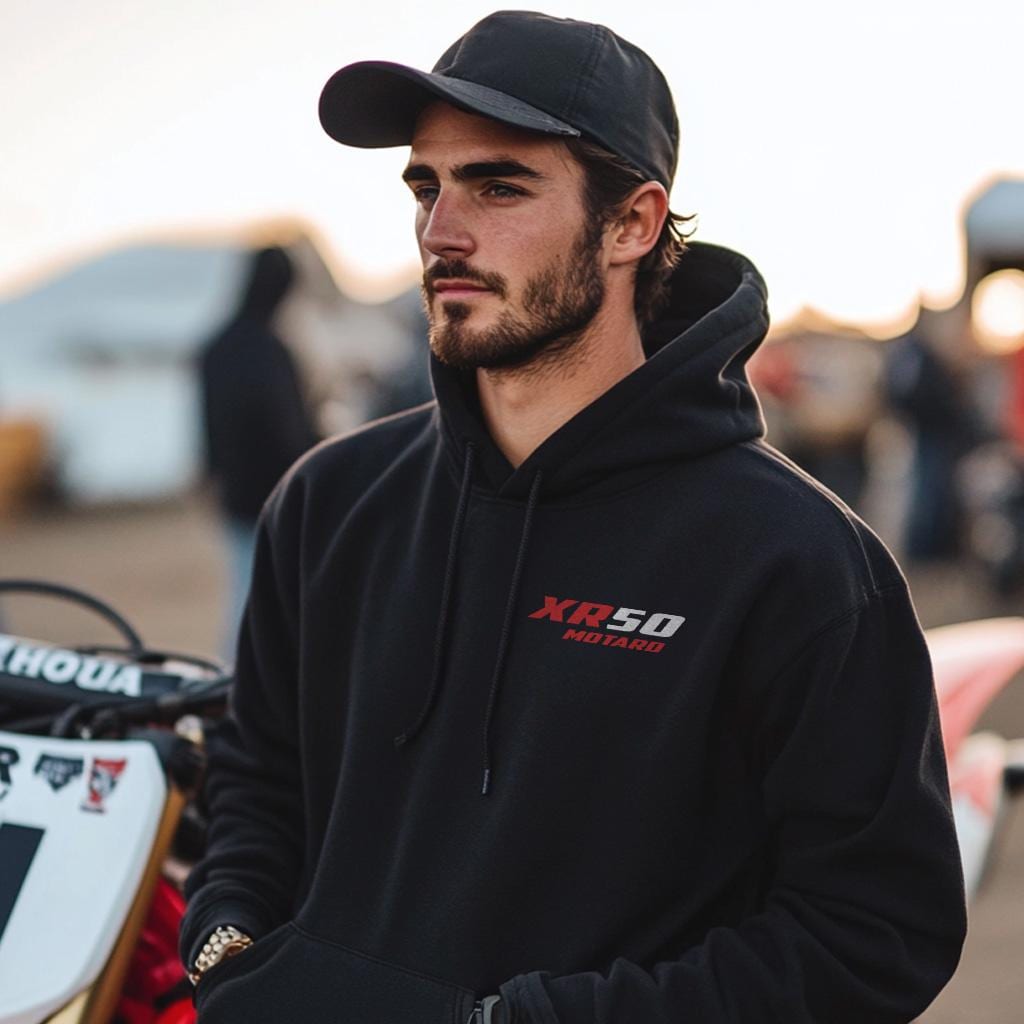 Hoodie for Honda XR50 Motard 2006 Motorcycle RidersStay warm while riding your motorcycle with this high-quality hooded pullover inspired by the Honda XR50 Motard and designed to be the perfect source of warmth and comfort during your motorcycle journeys.This hoodie serves as the ultimate homage to these legendary motorcycles that have stolen the hearts of riders worldwide. Crafted with a three-panel fleece lining, this pullover hoodie ensures durability as you ride. Double stitched for added strength, it offers ample room for your riding movements. You can also find t-shirts with this same design in our shop.Whether you're a dedicated enthusiast of this bike or simply a lover of motorcycles, this hoodie is an excellent way to express your affection for these iconic bikes. With a variety of sizes to choose from, it also makes an ideal gift for any motorcycle rider or motorcycle enthusiast.Why wait? Get your motorcycle hoodie today and savor the epitome of style, comfort, and adventure! This stylish hoodie is a great way to upgrade your bike life and stands out as one of the finest gifts for motorcycle riders, motorbike aficionados, motorcycle fans and lovers of motorcycle gear.Unisex Classic Pullover Hoodie:- Classic fit