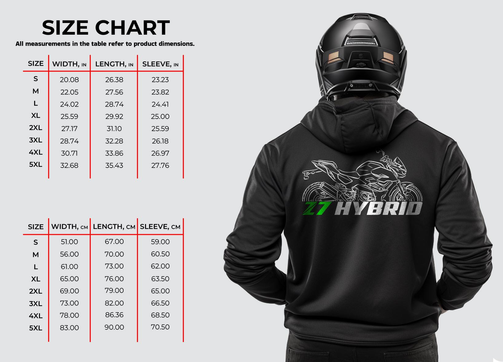 Hoodies for Kawasaki Z7 Hybrid 2024 Motorcycle RidersStay warm while riding your motorcycle with this high-quality hoodie pullover inspired by the Kawasaki Z7 Hybrid 2024 and designed to be the perfect source of warmth and comfort during your motorcycle journeys.This hoodie serves as the ultimate homage to these legendary motorcycles that have stolen the hearts of riders worldwide. Crafted with a three-panel fleece lining, this pullover hoodie ensures durability as you ride. Double stitched for added strength, it offers ample room for your riding movements. You can also find t-shirts with this same design in our shop.Whether you're a dedicated enthusiast of this bike or simply a lover of motorcycles, this hoodie is an excellent way to express your affection for these iconic bikes. With a variety of sizes to choose from, it also makes an ideal gift for any motorcycle rider or motorcycle enthusiast.Why wait? Get your motorcycle hoodie today and savor the epitome of style, comfort, and adventure! This stylish hoodie is a great way to upgrade your bike life and stands out as one of the finest gifts for motorcycle riders, motorbike aficionados, motorcycle fans and lovers of motorcycle gear.Unisex Classic Pullover Hoodie:- Classic fit