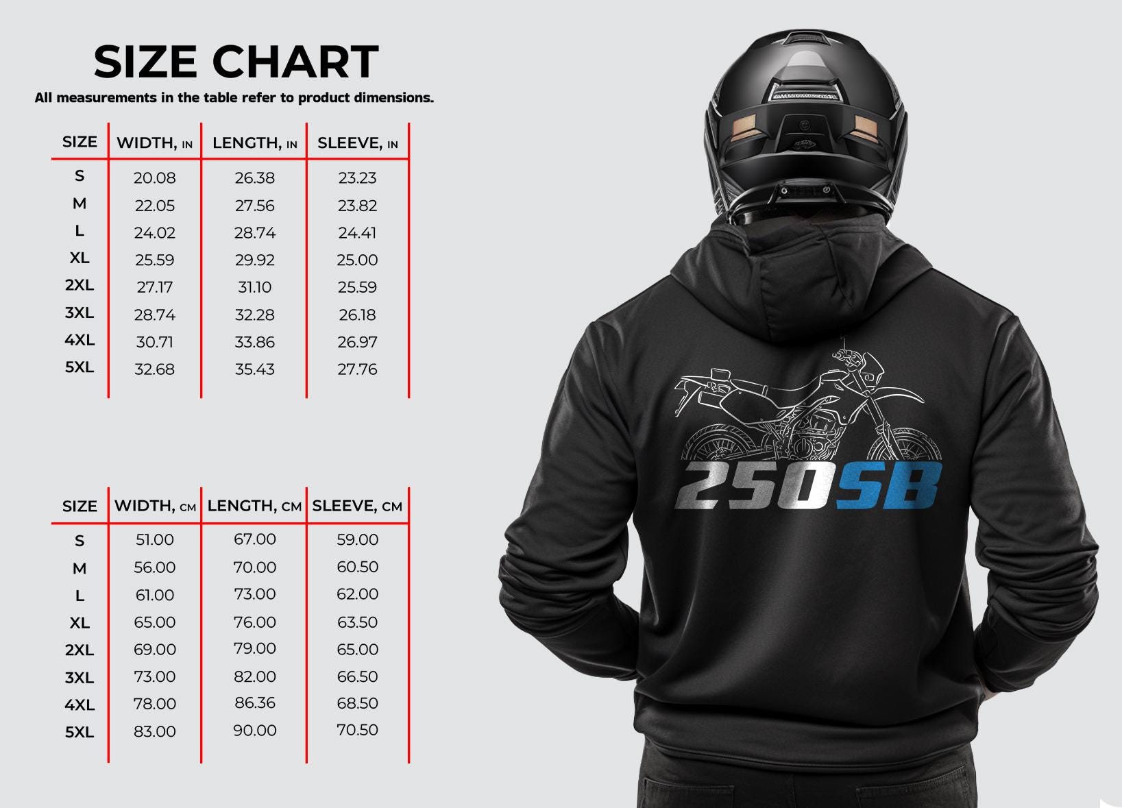 Hoodies for Suzuki 250SB Motorcycle RidersStay warm while riding your motorcycle with this high-quality hooded pullover designed to be the perfect source of warmth and comfort during your motorcycle journeys.Inspired by iconic bike , this hoodie serves as the ultimate homage to these legendary motorcycles that have stolen the hearts of riders worldwide. Crafted with a three-panel fleece lining, this pullover hoodie ensures durability as you ride. Double stitched for added strength, it offers ample room for your riding movements. You can also find t-shirts with this same design in our shop.Whether you're a dedicated enthusiast of this bike or simply a lover of motorcycles, this hoodie is an excellent way to express your affection for these iconic bikes. With a variety of sizes to choose from, it also makes an ideal gift for any motorcycle rider or motorcycle enthusiast.Why wait? Get your motorcycle hoodie today and savor the epitome of style, comfort, and adventure! This stylish hoodie is a great way to upgrade your bike life and stands out as one of the finest gifts for motorcycle riders, motorbike aficionados, motorcycle fans and lovers of motorcycle gear.Unisex Classic Pullover Hoodie:- Classic fit