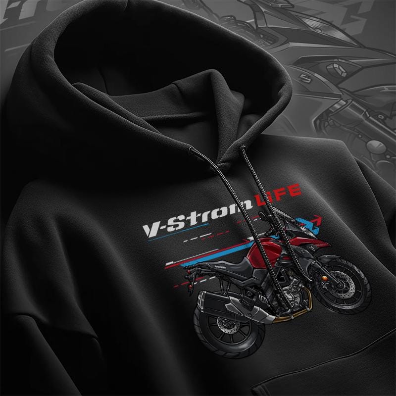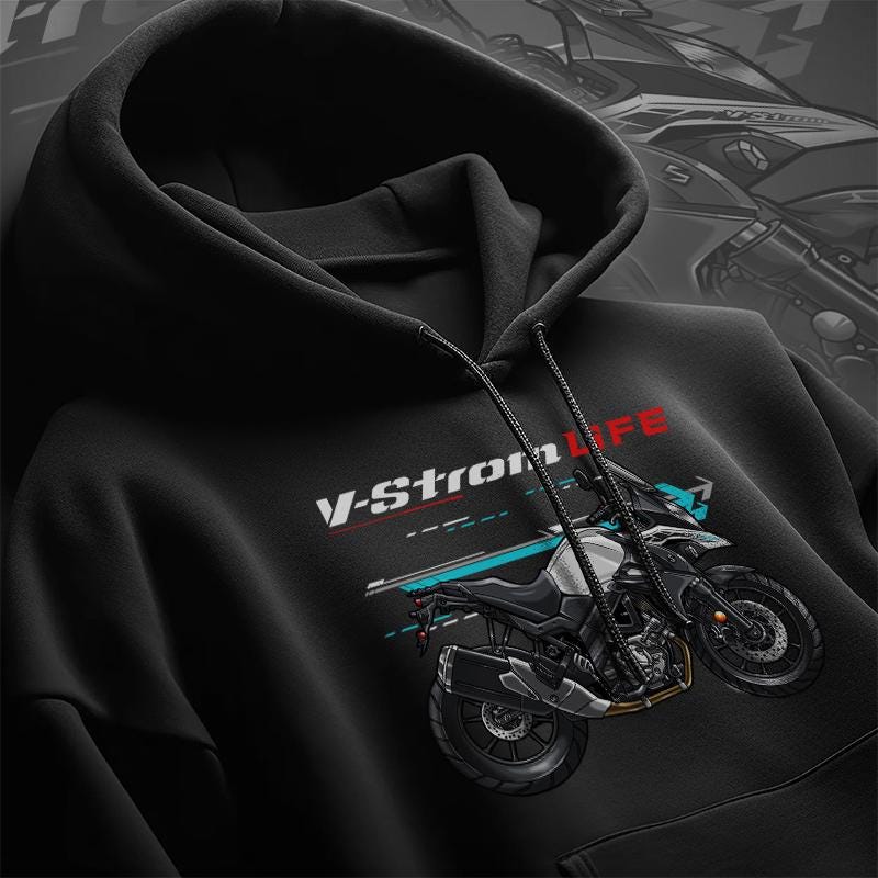 Hoodies for Suzuki V-Storm 650 Motorcycle RidersStay warm while riding your motorcycle with this high-quality Suzuki V-Storm 650 hooded pullover designed to be the perfect source of warmth and comfort during your motorcycle journeys.Inspired by the iconic Suzuki V-Storm 650 design, this hoodie serves as the ultimate homage to these legendary motorcycles that have stolen the hearts of riders worldwide. Crafted with a three-panel fleece lining, this pullover hoodie ensures durability as you ride. Double stitched for added strength, it offers ample room for your riding movements. You can also find t-shirts with this same design in our shop.Whether you're a dedicated enthusiast of the Suzuki V-Storm 650 or simply a lover of motorcycles, this hoodie is an excellent way to express your affection for these iconic bikes. With a variety of sizes to choose from, it also makes an ideal gift for any motorcycle rider or motorcycle enthusiast.Why wait? Get your motorcycle hoodie today and savor the epitome of style, comfort, and adventure! This stylish hoodie is a great way to upgrade your bike life and stands out as one of the finest gifts for motorcycle riders, motorbike aficionados, motorcycle fans and lovers of motorcycle gear.Unisex Classic Pullover Hoodie:- Classic fit